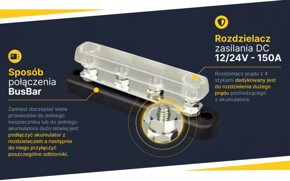 Rozdzielacz zasilania DC 12/24V - 150A z 4 stykami dedykowany jest do rozdzielenia dużego prądu pochodzącego z . Zamiast doczepiać wiele przewodów do jednego bezpiecznika lub do jednego akumulatora dużo łatwiej jest podłączyć akumulator z rozdzielaczem a następnie do niego przyłączyć poszczególne odbiorniki. Taki sposób połączenia zapewnia estetykę oraz wygodę a co najważniejsze bezpieczeństwo połączeń.