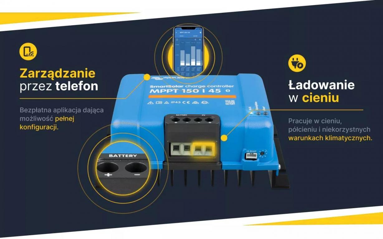 Regulatory ładowania w wersji Smart Holenderskiego producenta Victron Energy to najbardziej zaawansowane urządzenia dostępne na rynku. Posiadają ultra szybki system śledzenia punktu mocy MPPT gwarantujący nawet do 50% więcej mocy niż w tradycyjnych regulatorach PWM. Umożliwiają również ładowanie w cieniu jak i w niekorzystnych warunkach oświetleniowych jakimi jest poranek oraz późne popołudnie.