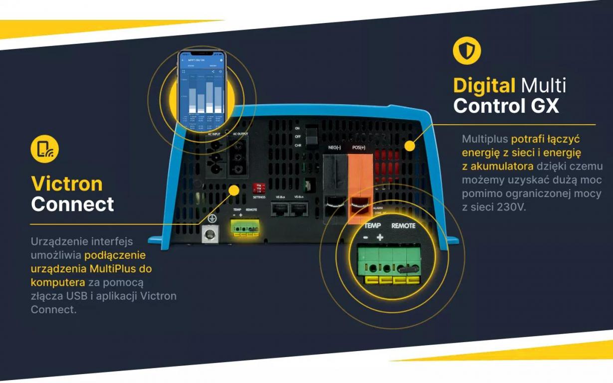 Urządzenie Multiplus oferuje kombinację przetwornicy napięcia z ładowarką. Dzięki możliwości komunikacji z komputerem umożliwia budowę zaawansowanego w pełni programowalnego urządzenia do zasilania awaryjnego UPS. Przetwornica Multiplus potrafi również łączyć dwa niezależne źródła zasilania w jedno np: energię z akumulatora z energią z agregatu prądotwórczego. Dzięki takiemu rozwiązaniu możliwe jest uzyskiwanie dużych mocy.