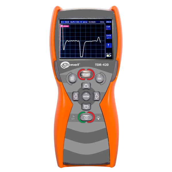Reflektometr Sonel TDR-420 jest poręcznym cyfrowym lokalizatorem impulsowym (TDR – ang. Time-domain Reflectometer) przeznaczonym do identyfikacji i lokalizacji uszkodzeń w kablach elektroenergetycznych, telekomunikacyjnych i teletechnicznych. Reflektometr Sonel TDR-420 pozwala na zmierzenie długości kabla oraz określenie odległości do uszkodzenia lub zmiany impedancyjnej w zakresie od 4 do 6000 m w przewodach z żyłami metalowymi. Najkrótszy zakres pomiarowy o zasięgu 7 metrów i strefie martwej długości 0,6 metra pozwala na lokalizację uszkodzeń w bardzo bliskiej odległości od miejsca podłączenia urządzenia.