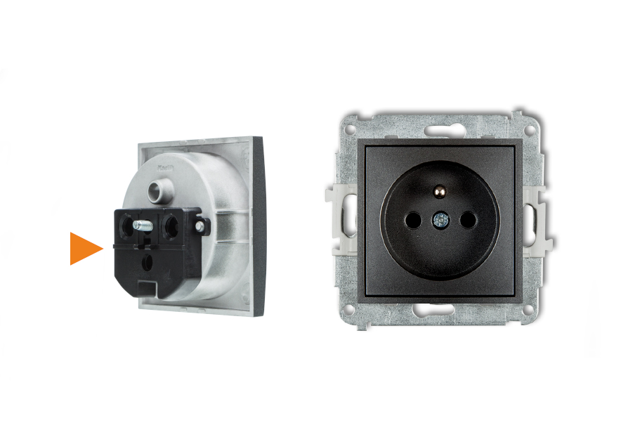 Metalowe pazurki ‑ służą do mocowania osprzętu w puszce instalacyjnej. Osłonięte przez kostkę z tworzywa pazurki ułatwiają wprowadzenie mechanizmu do puszki oraz pozwalają uniknąć uszkodzenia izolacji przewodów i skaleczeń podczas instalacji.