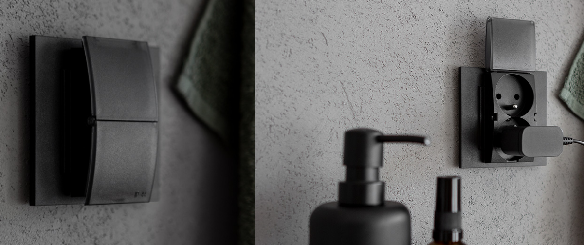 na pół klapki gniazd z serii Simon 55 są bryzgoszczelne.