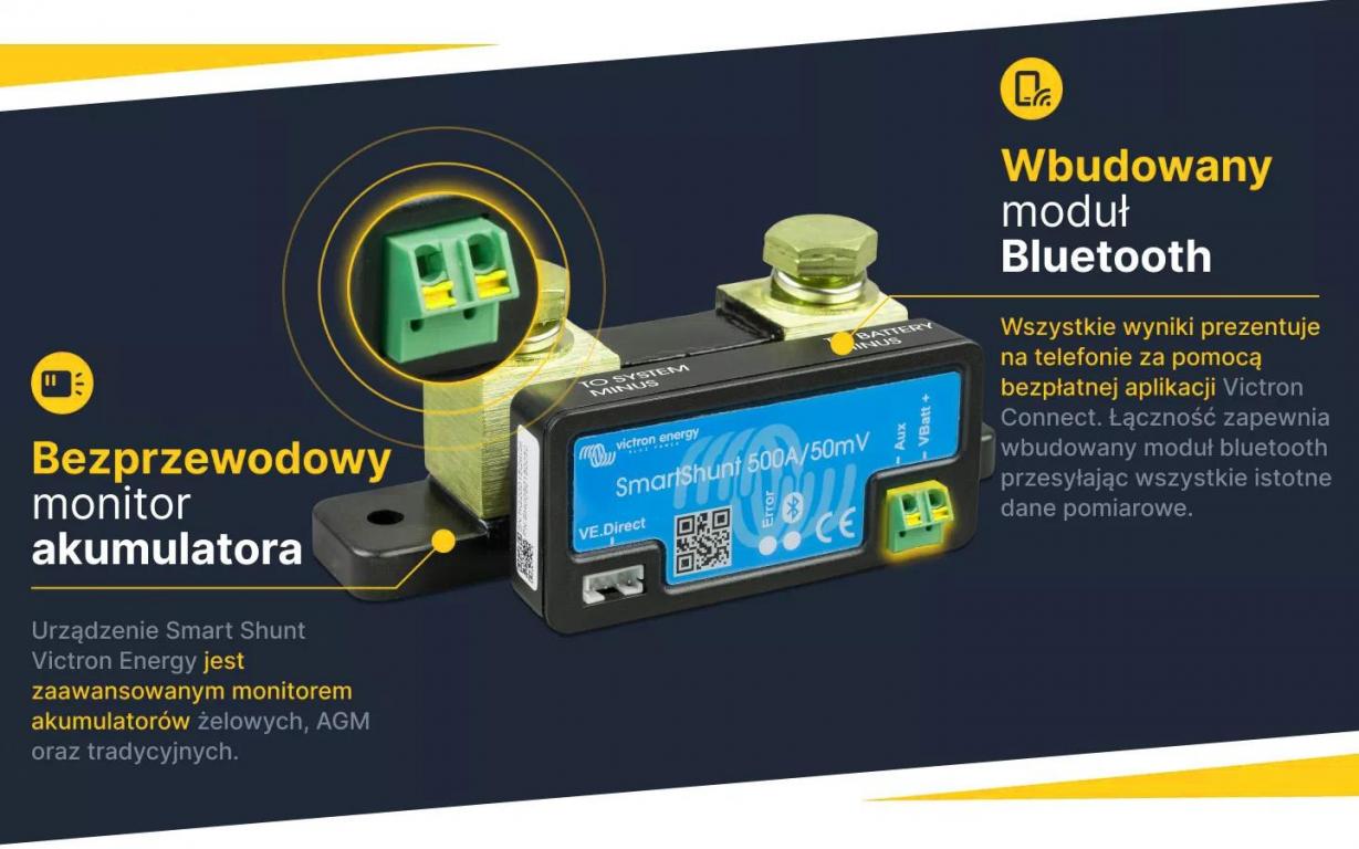 Urządzenie Smart Shunt jest zaawansowanym monitorem żelowych, AGM oraz tradycyjnych. Umożliwia monitorowanie wielu parametrów takich jak napięcie, prąd, moc, ilość cykli akumulatora oraz wiele więcej. Nie posiada jednak wyświetlacza tak jak klasyczne monitory akumulatorów BMV 700 lub 712 a wszystkie wyniki prezentuje na telefonie za pomocą bezpłatnej aplikacji Victron Connect. Łączność zapewnia wbudowany moduł bluetooth przesyłając wszystkie istotne dane pomiarowe.