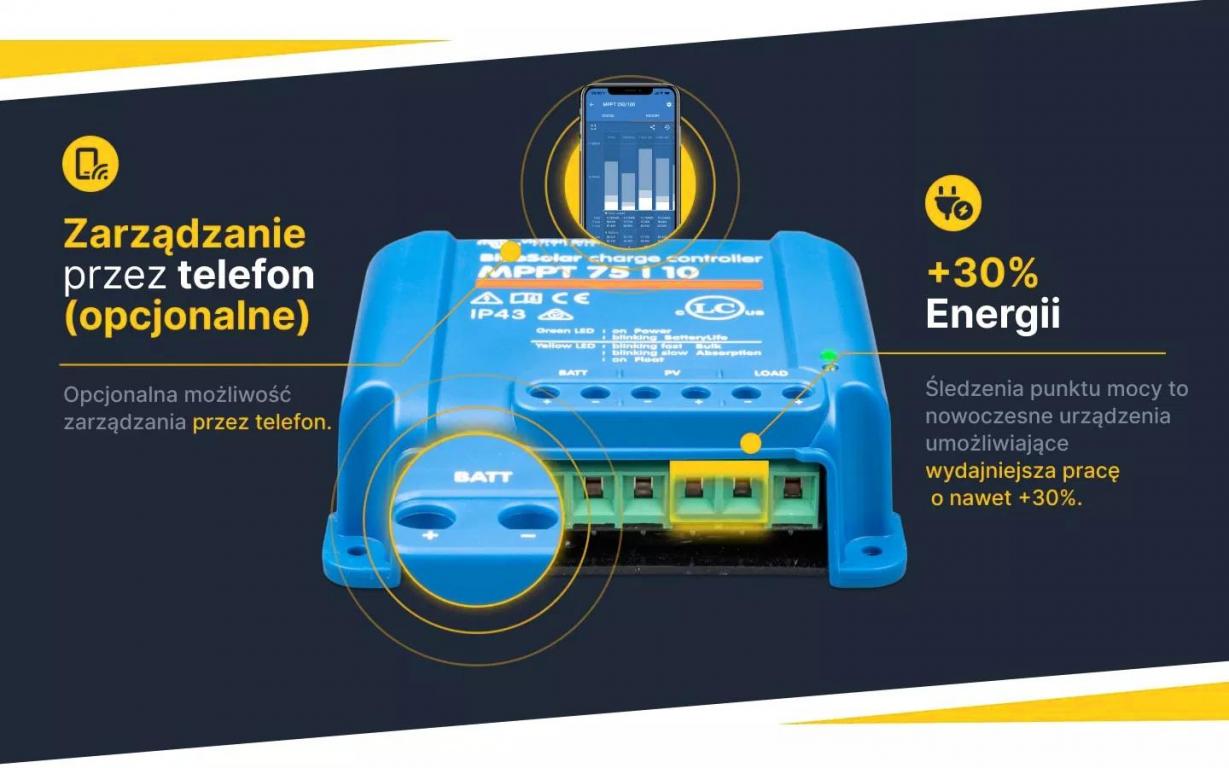 Regulatory ładowania MPPT wyposażone w funkcję śledzenia punktu mocy to nowoczesne urządzenia umożliwiające wydajniejsza pracę z tradycyjnymi słonecznymi. Dzięki zaawansowanej elektronice śledzi najbardziej optymalne parametry pracy i napięcie panela słonecznego, co pozwala na uzyskanie wyższej sprawności i wydajności niż tradycyjne regulatory ładowania PWM o 10% - 30%. Regulatory MPPT cechują się również wyższą wydajnością pracy podczas pochmurnych dni lub w półcieniu.Decydując się na wprowadzenie do naszej oferty regulatorów MPPT postawiliśmy na Holenderską firmę Victron Energy, oferującą najwyższą wydajność oraz optymalną cenę. Regulatory VE są cenione i chwalone na rynku fotowoltaicznym oraz deklasują wszystkie regulatory chińskiej konstrukcji. Regulator opcjonalnie można obsługiwać za pomocą telefonu. Należy jednak dokupić interfejs Blue Tooth Dongle