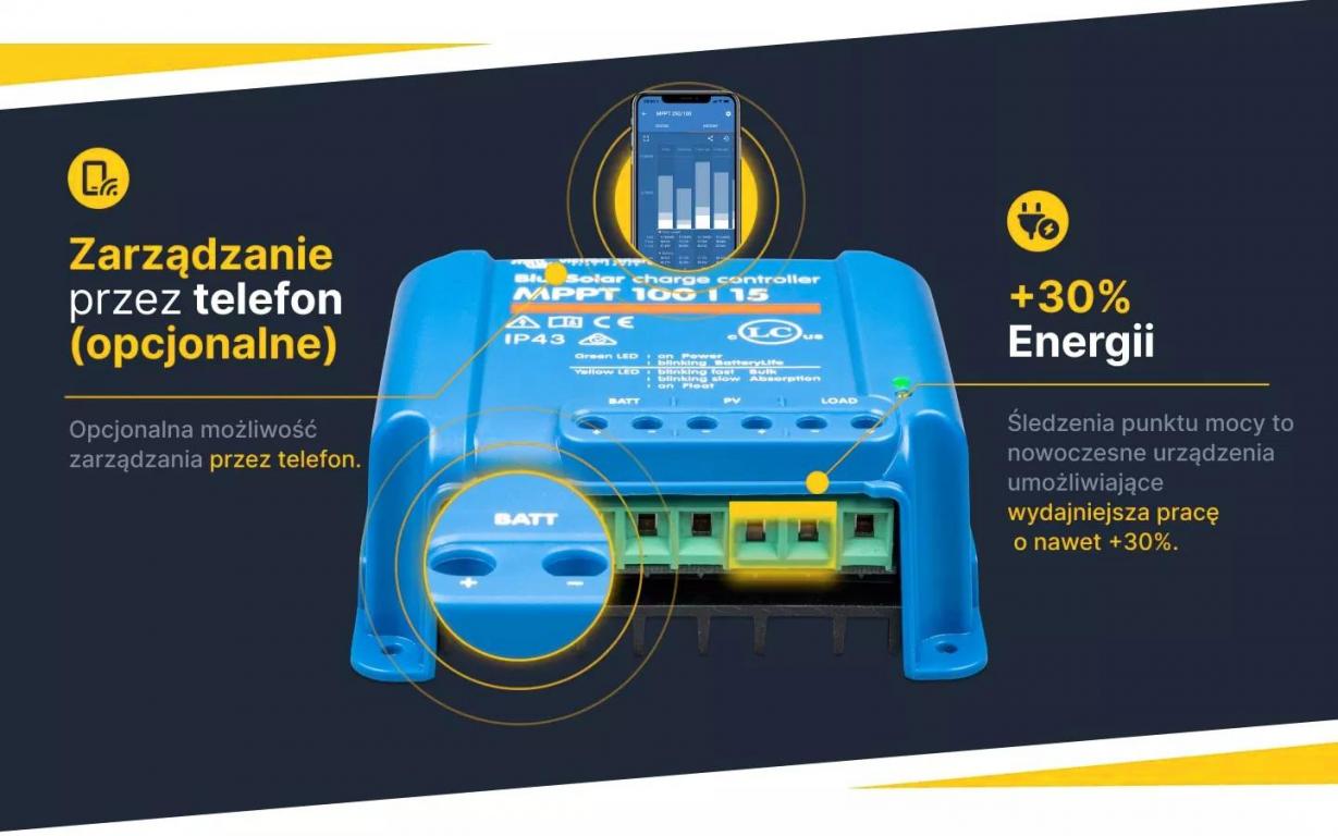 Regulatory ładowania MPPT wyposażone w funkcję śledzenia punktu mocy to nowoczesne urządzenia umożliwiające wydajniejsza pracę z tradycyjnymi słonecznymi. Dzięki zaawansowanej elektronice regulator śledzi najbardziej optymalne parametry pracy i napięcie panela słonecznego, co pozwala na uzyskanie wyższej sprawności i wydajności niż tradycyjne ładowania PWM o 10% - 30%. Regulatory MPPT cechują się również wyższą wydajnością pracy podczas pochmurnych dni lub w półcieniu.Decydując się na wprowadzenie do naszej oferty regulatorów MPPT postawiliśmy na Holenderską firmę Victron Energy, oferującą najwyższą wydajność oraz optymalną cenę. Regulatory VE są cenione i chwalone na rynku fotowoltaicznym oraz deklasują wszystkie regulatory chińskiej konstrukcji. Regulator opcjonalnie można obsługiwać za pomocą telefonu. Należy jednak dokupić interfejs Blue Tooth Dongle