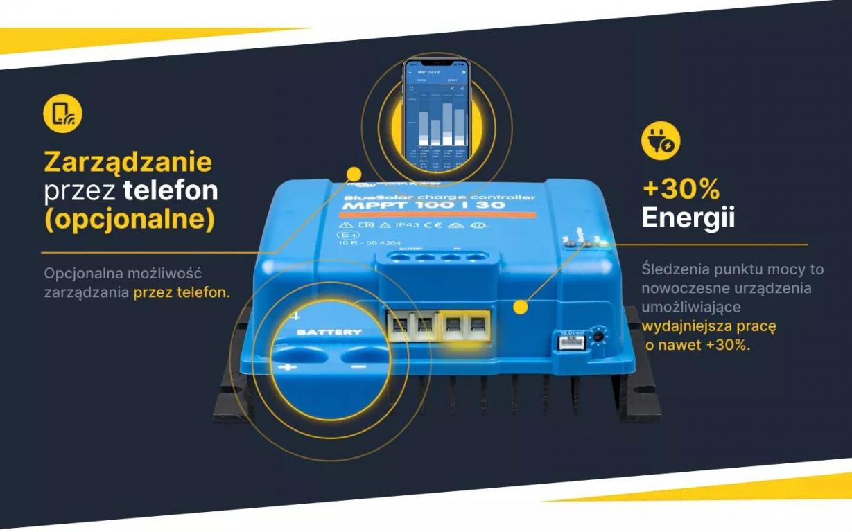 Regulatory ładowania MPPT wyposażone w funkcję śledzenia punktu mocy to nowoczesne urządzenia umożliwiające wydajniejsza pracę z tradycyjnymi słonecznymi. Dzięki zaawansowanej elektronice regulator śledzi najbardziej optymalne parametry pracy i napięcie panela słonecznego, co pozwala na uzyskanie wyższej sprawności i wydajności niż tradycyjne ładowania PWM o 10% - 30%. Regulatory MPPT cechują się również wyższą wydajnością pracy podczas pochmurnych dni lub w półcieniu.Decydując się na wprowadzenie do naszej oferty regulatorów MPPT postawiliśmy na Holenderską firmę Victron Energy, oferującą najwyższą wydajność oraz optymalną cenę. Regulatory VE są cenione i chwalone na rynku fotowoltaicznym oraz deklasują wszystkie regulatory chińskiej konstrukcji. Regulator opcjonalnie można obsługiwać za pomocą telefonu. Należy jednak dokupić interfejs Blue Tooth Dongle
