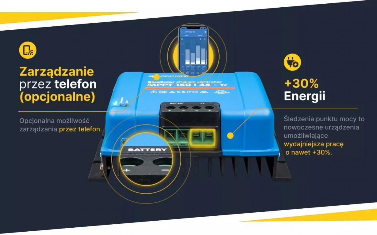 Regulatory ładowania MPPT wyposażone w funkcję śledzenia punktu mocy to nowoczesne urządzenia umożliwiające wydajniejsza pracę z tradycyjnymi słonecznymi. Dzięki zaawansowanej elektronice regulator śledzi najbardziej optymalne parametry pracy i napięcie panela słonecznego, co pozwala na uzyskanie wyższej sprawności i wydajności niż tradycyjne ładowania PWM o 10% - 30%. Regulatory MPPT cechują się również wyższą wydajnością pracy podczas pochmurnych dni lub w półcieniu.Decydując się na wprowadzenie do naszej oferty regulatorów MPPT postawiliśmy na Holenderską firmę Victron Energy, oferującą najwyższą wydajność oraz optymalną cenę. Regulatory VE są cenione i chwalone na rynku fotowoltaicznym oraz deklasują wszystkie regulatory chińskiej konstrukcji. Regulator opcjonalnie można obsługiwać za pomocą telefonu. Należy jednak dokupić interfejs Blue Tooth Dongle