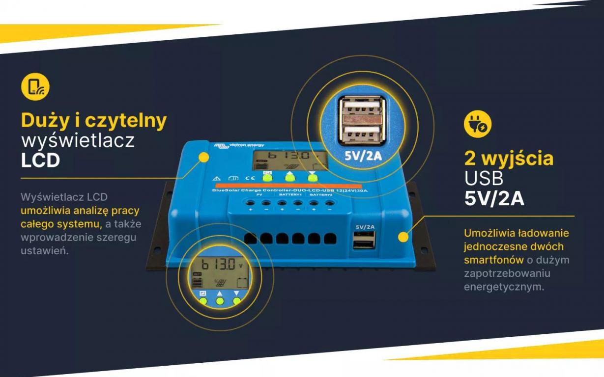 Na uwagę zasługują dwa wyjścia USB 5V 2A, które umożliwiają ładowanie jednoczesne dwóch smartfonów o dużym zapotrzebowaniu energetycznym takie jak najnowszy IPhone czy Samsung. Inna przydatną opcją jest sterowanie oświetleniem dzień/noc. Regulator po wykryciu zmierzchu potrafi załączyć zasilanie a o świcie je wyłączyć.Regulator posiada pełne zabezpieczenie zarówno przed prądem zwrotnym z paneli jak i przez zbyt wysokim napięciem ładowania. Umożliwia pracę zarówno z 12V jak i z zestawem akumulatorów o napięciu roboczym 24V.