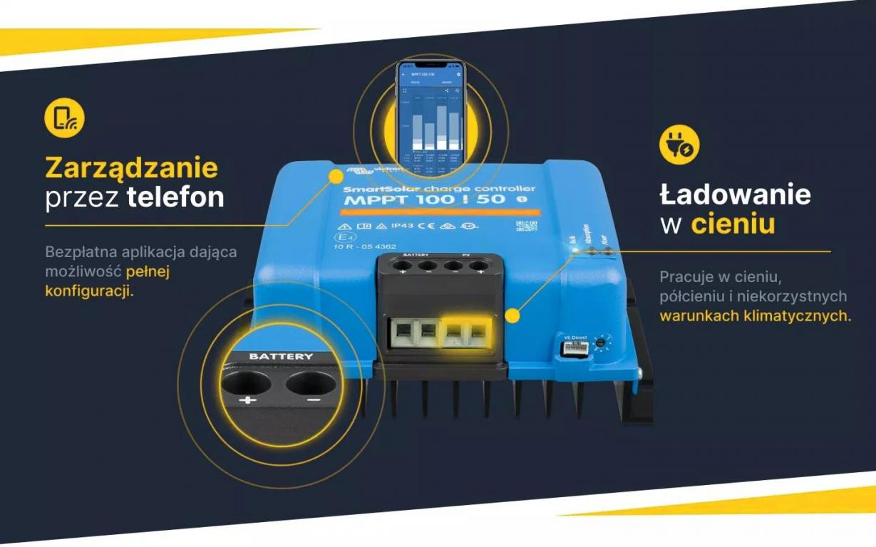 Regulatory ładowania w wersji Smart Holenderskiego producenta Victron Energy to najbardziej zaawansowane urządzenia dostępne na rynku. Posiadają ultra szybki system śledzenia punktu mocy MPPT gwarantujący nawet do 50% więcej mocy niż w tradycyjnych regulatorach PWM. Umożliwiają również ładowanie w cieniu jak i w niekorzystnych warunkach oświetleniowych jakimi jest poranek oraz późne popołudnie.