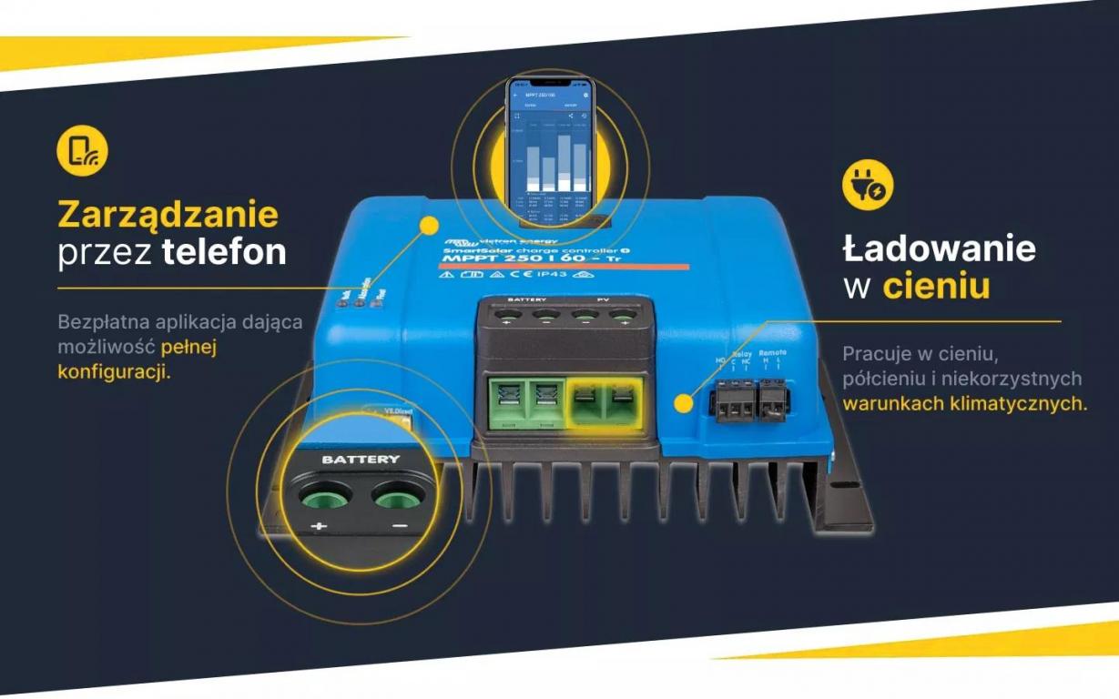 Po podłączeniu dowolnego telefonu komórkowego i zainstalowaniu bezpłatnej aplikacji pobranej ze sklepu internetowego np Google lub APStore możliwy jest dostęp do urządzenia przez połączenie bluetooth.Dzięki temu mamy możliwość pełnej konfiguracji takiej jak zmiana rodzaju akumulatora, włączenie światła nocnego, zmianę progów załączania i wyłączania regulatora w zależności od pory dnia a także możemy wyświetlać aktualny stan urządzenia. Możliwy jest również odczyt aktualnego napięcia paneli i akumulatora, prądów wchodzących i wychodzących a także wskazań historycznych. Regulator Smart solar to aktualnie najnowocześniejsze urządzenie dostępne na rynku jednocześnie dysponujące rewelacyjnym układem MPPT.