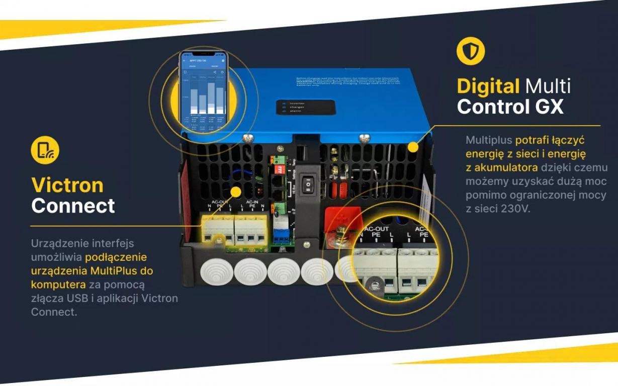 Urządzenie Multiplus oferuje kombinację przetwornicy napięcia z ładowarką. Dzięki możliwości komunikacji z komputerem umożliwia budowę zaawansowanego w pełni programowalnego urządzenia do zasilania awaryjnego UPS. Przetwornica Multiplus potrafi również łączyć dwa niezależne źródła zasilania w jedno np: energię z akumulatora z energią z agregatu prądotwórczego. Dzięki takiemu rozwiązaniu możliwe jest uzyskiwanie dużych mocy.