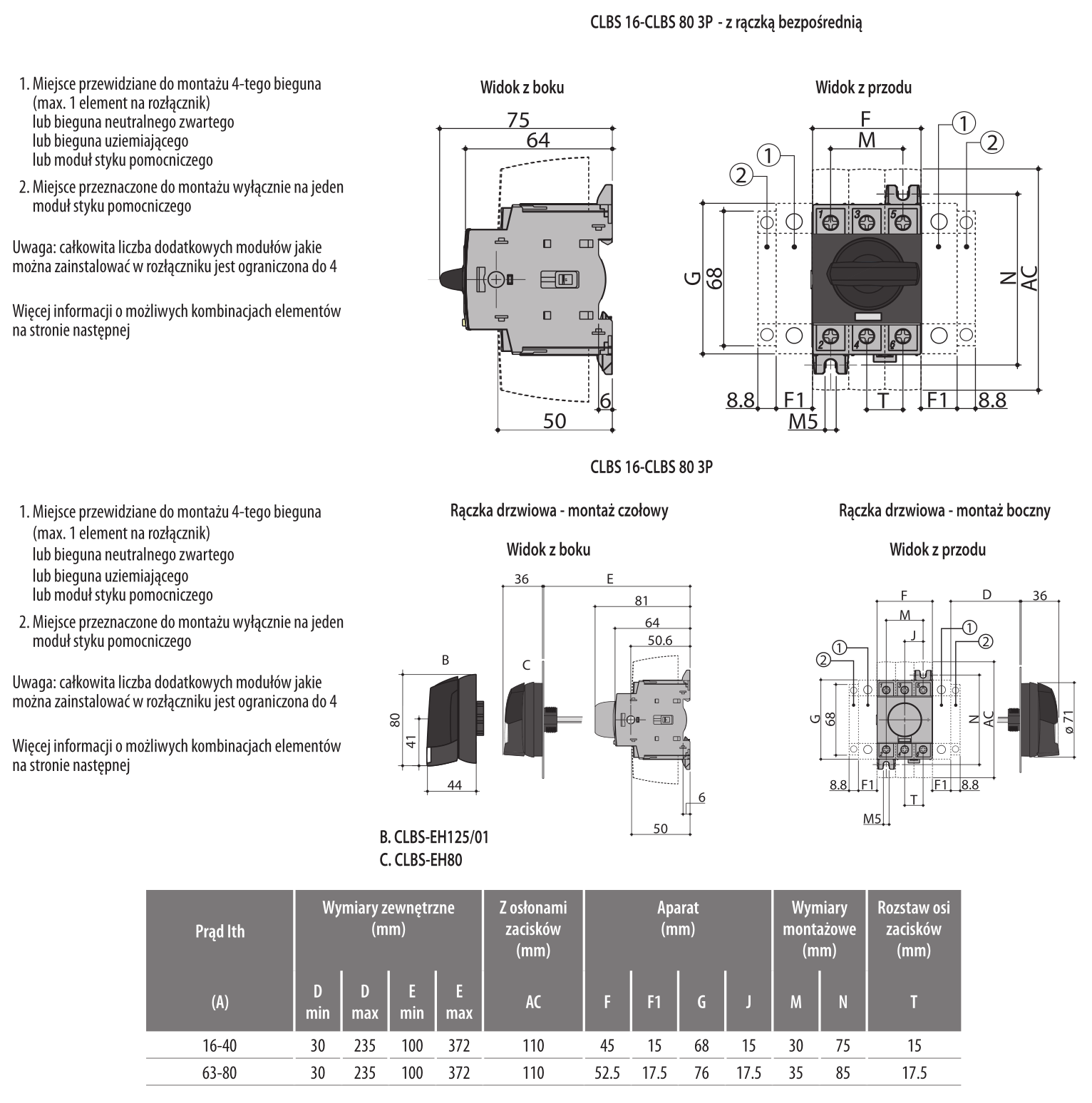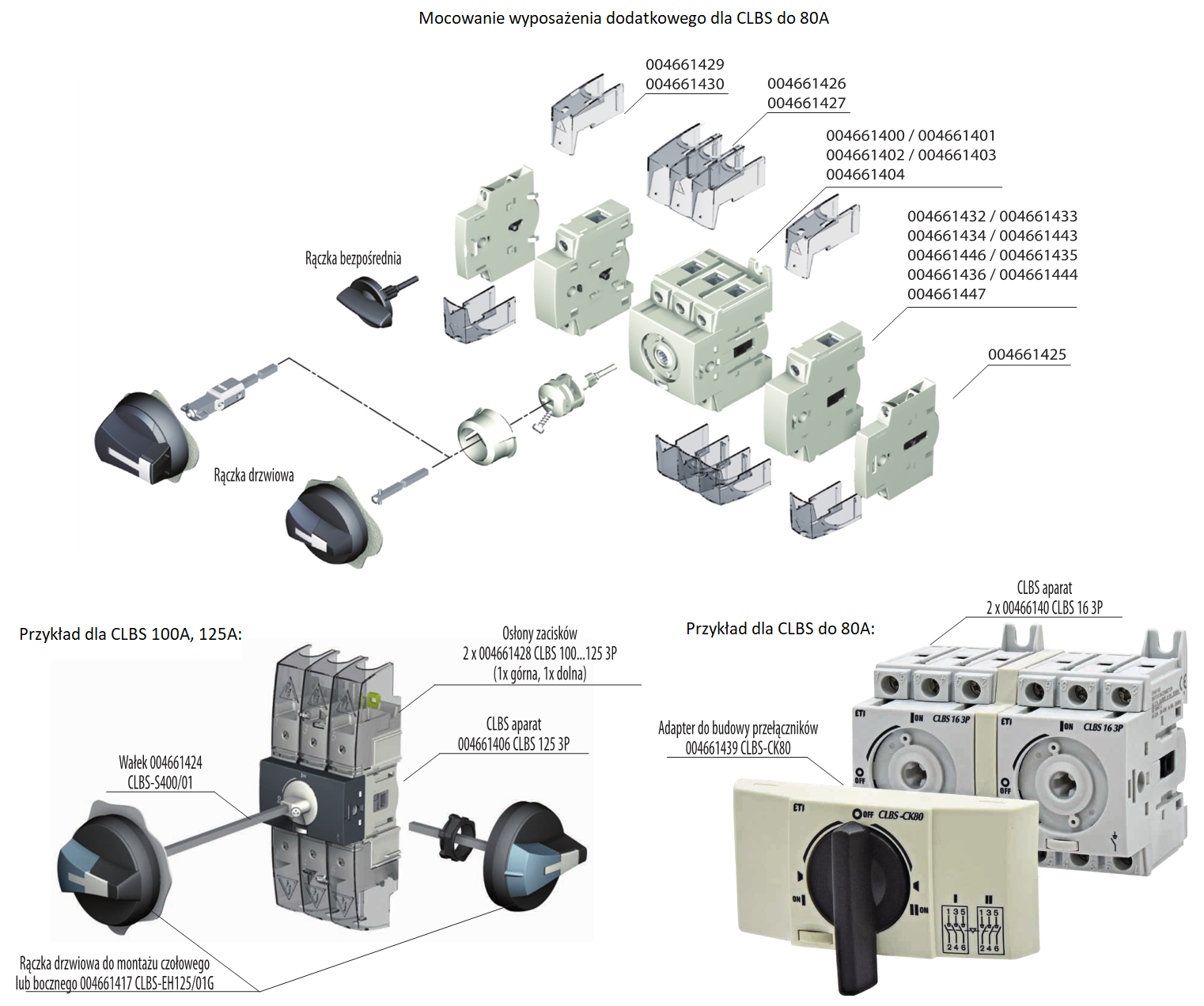 - Z podstawowych 3-biegunowych rozłączników można otrzymać aparaty 4-, 6- lub 8-biegunowe lub przełączniki (I-0-II za pomocą adaptera CLBS-CK) 3/4 -biegunowe.