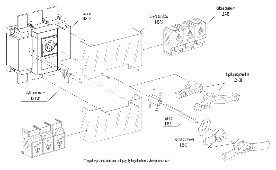 - Możliwość dodania styków pomocniczych LBS-PS11 i drugich styków pomocniczych LBS-2PS11. Zmiana stanu styków wyprzedza zmianę stanu torów głównych aparatu przy przejściu z pozycji I do 0.
