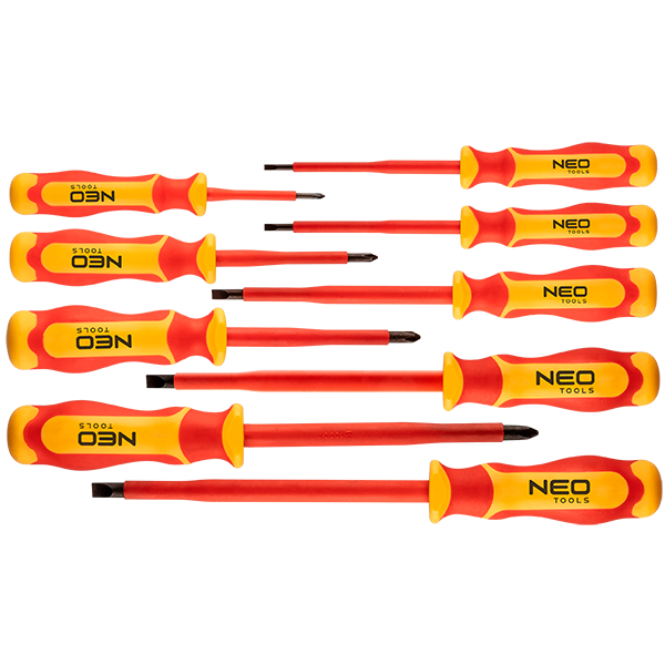 Uniwersalny zestaw wkrętaków, atestowany dopracy znapięciem do1000V. Zawiera różnej wielkości dziewięć narzędzi płaskich orazkrzyżowych. Ich groty wykonane są zwytrzymałej stali S2. Końcówka robocza wkrętaka została dodatkowo poddana obr/óbce cieplnej, dzięki czemu narzędzie posiada odpowiednią twardość, nawet dopracy zwymagającymi materiałami.