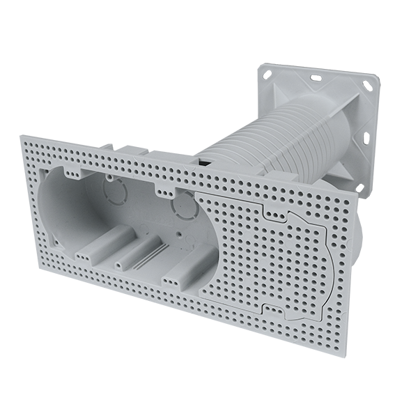 - Puszka do instalacji dwóch do trzech urządzeń w ocieplanych elewacjach budynków o grubości warstwy ocieplającej 100 ‑ 250 mm.
