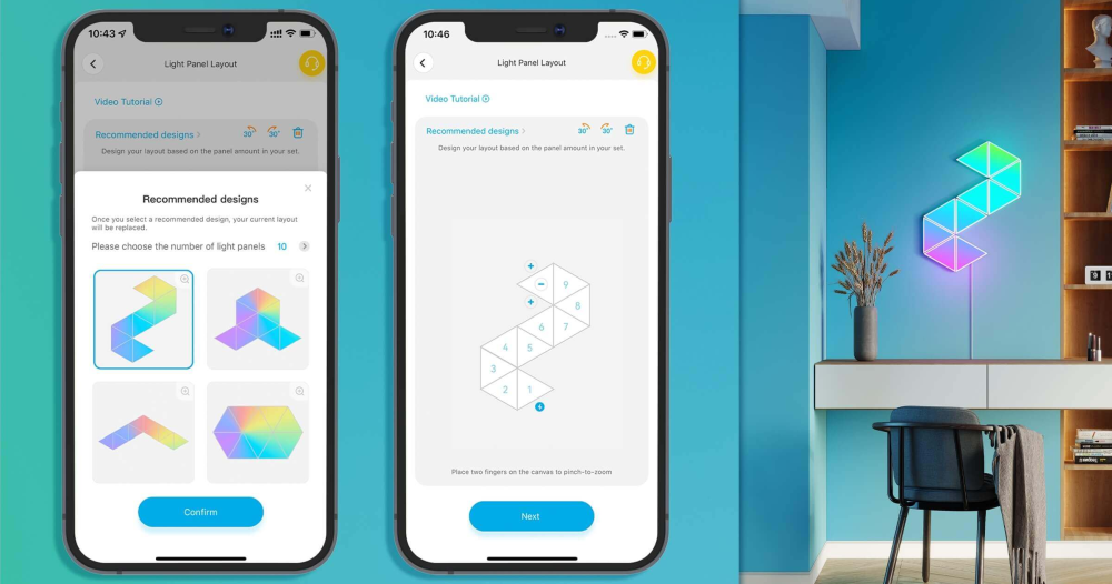 Aplikacja Govee Home ma do wyboru wiele efektów scenicznych, w tym Sunset Glow, Stacking, Flow i inne. Rozmieszczenie Twoich paneli zostanie rozpoznane, aby stworzyć tęczowy efekt, który płynnie przepływa.