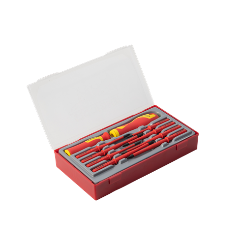 Zestaw wkrętaków składający się z 10 elementów: 8 trzonów wkrętakowych i 2 rękojeści. Wygodny system pozwalający dostosować w łatwy sposób narzędzie do wykonywanej pracy. Grubsza rękojeść przeznaczona do prac wymagających użycia większej siły. Mniejsza i cieńsza rękojeść przeznaczona do prac precyzyjniejszych ‑ na końcu rękojeści obrotowy element z miejscem na palec. Produkowane i testowane zgodnie z IEC 60900. Do prac pod napięciem do 1000V (przez specjalnie przeszkolony personel). Dostarczany w zasobniku z tworzywa sztucznego z odłączaną pokrywą. Pasuje do skrzynek i wózków narzędziowych Teng Tools.