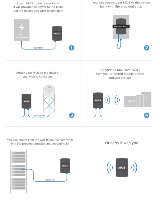 MQS można zasilać za pomocą power banku lub ładowarki USB. Oferuje PoE do zasilania urządzeń, więc nie potrzebujesz nawet prądu, aby przeprowadzić konserwację, diagnostykę lub instalację sieciową.