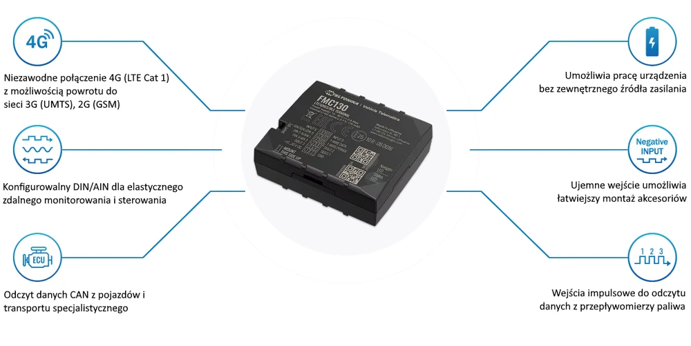 Teltonika FMC130 - jest to kompaktowy, profesjonalny terminal śledzący, który umożliwia monitorowanie w czasie rzeczywistym. Posiada także zapasowy akumulator, który zapewnia długotrwałą autonomiczną pracę urządzenia. Stanowi on rozwinięcie funkcji poprzedniego modelu, wykorzystując najbardziej zaawansowane technologie.