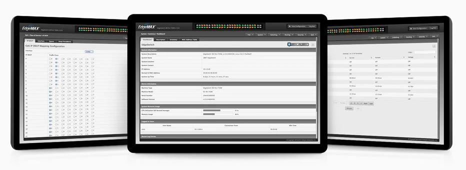 EdgeSwitch został zaprojektowany z myślą o wygodnym zarządzaniu, co pozwala administratorom konfigurować i monitorować funkcje przełącznika w interfejsie graficznym użytkownika. Dla zaawansowanych użytkowników przeznaczony jest standardowy interfejs linii poleceń (CLI), dostępny za pośrednictwem szeregowego portu konsoli, sieci telnet i SSH.