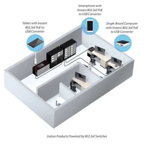 Instant 802.3af PoE do USB jest konwerterem, który idealnie współpracuje z wieloma przełącznikami PoE, automatycznie wykrywając 802.3af PoE. Urządzenie zapewnia łatwe zasilanie urządzeń obsługujących port USB. Konwerter Instant łączy się z portem USB urządzenia, aby efektywnie zasilać jego połączenie przewodowe.