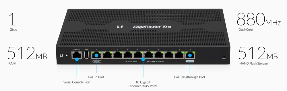 EdgeRouter 10X pracuje z wydajnością 260 000 pakietów na sekundę i z szybkością linii wynoszącą 1 Gbps. Dziesięć gigabitowych portów RJ45 oferuje łączność z wejściem PoE na porcie 1 i passthrough PoE na porcie 10. Urządzenie obsługuje przełączanie warstwy 2.