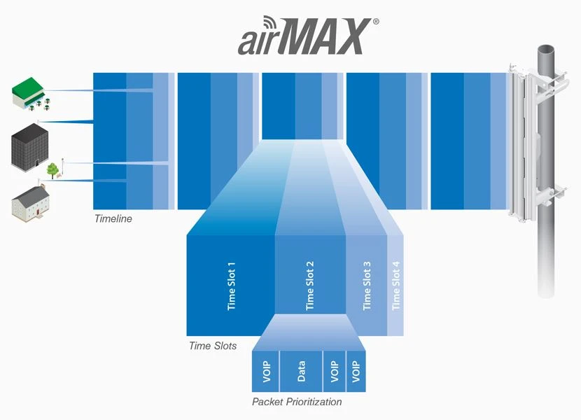 Time Division Multiple Access firmy Ubiquiti (TDMA) jest protokołem AirMax, który pozwala każdemu Klientowi na wysyłanie i odbieranie danych za pomocą wstępnie wyznaczonych szczelin czasowych zaplanowanych przez inteligentny kontroler AP. Metoda „szczelin czasowych” eliminuje kolizje w sieci i maksymalizuje efektywność czasu antenowego. Zapewnia również znaczną poprawę wydajności, skalowalności i opóźnień w porównaniu do innych systemów sieci bezprzewodowych przeznaczonych do montażu zewnętrznego.