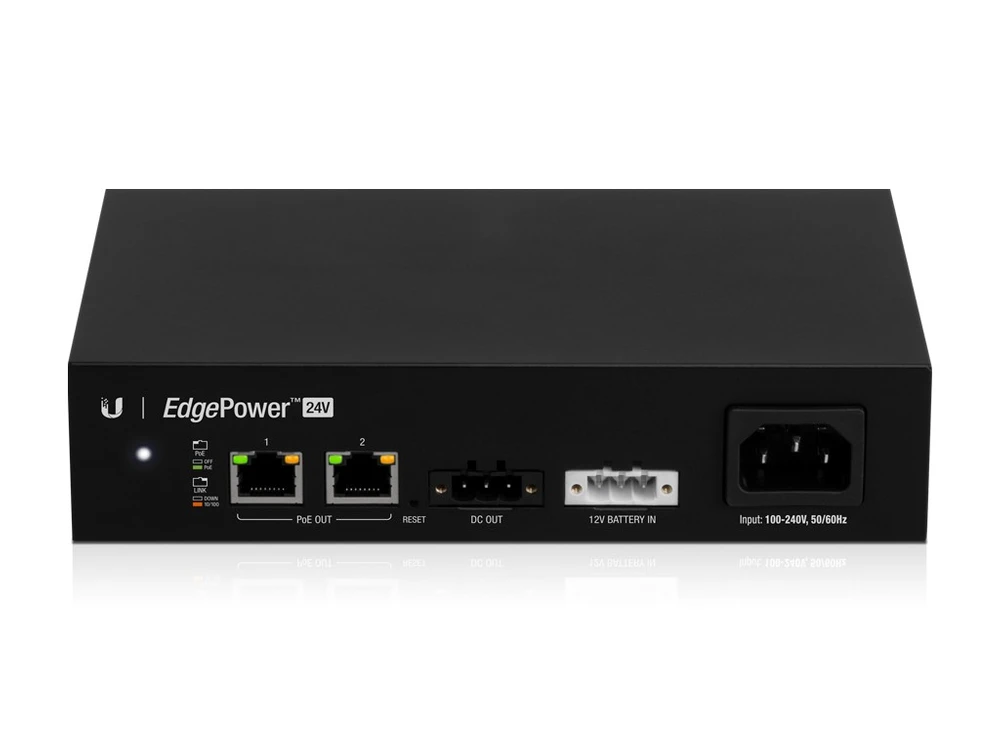 Zasilacz EdgePower EP‑24 V‑72 W to praktyczne urządzenie z UPS oraz dwoma portami wyjściowymi PoE, które zapewnia ochronę witryny WISP przed przerwą zasilania. Urządzenie posiada 12-woltowe wejście dla akumulatora kwasowo-ołowiowego, które zapewnia zabezpieczenie w przypadku awarii zasilania z sieci AC i opcję powiadomienia o przerwie w dostawie prądu.