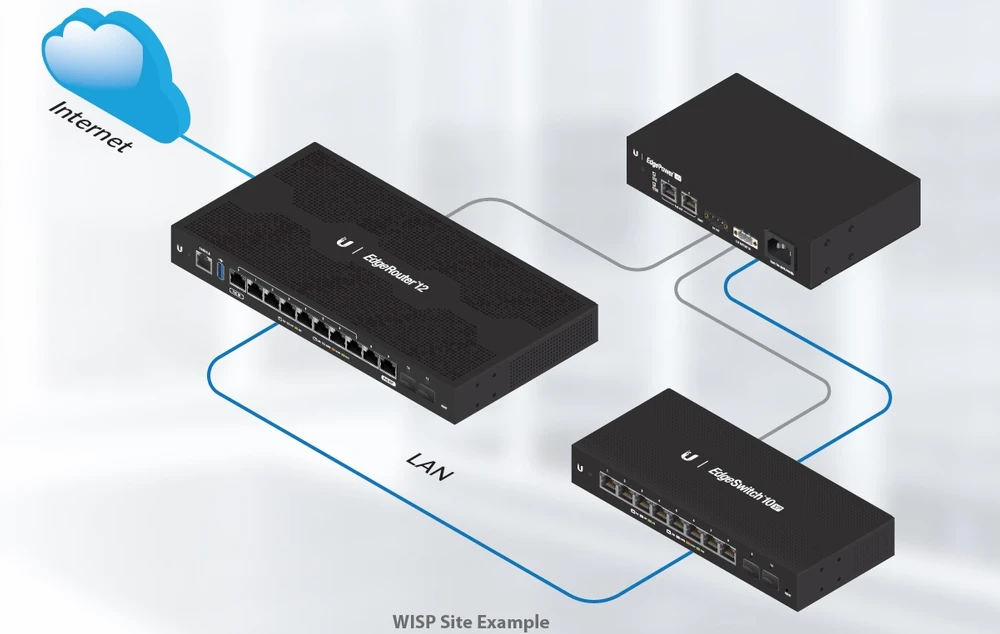 EP-24V-72W can power both the EdgeRouter™ ER-12, which functions as a gateway, and the EdgeSwitch ES-10XP, which serves as a PoE switch for the LAN network. EdgePower can also be connected to the EdgeSwitch using an Ethernet cable for management purposes.
