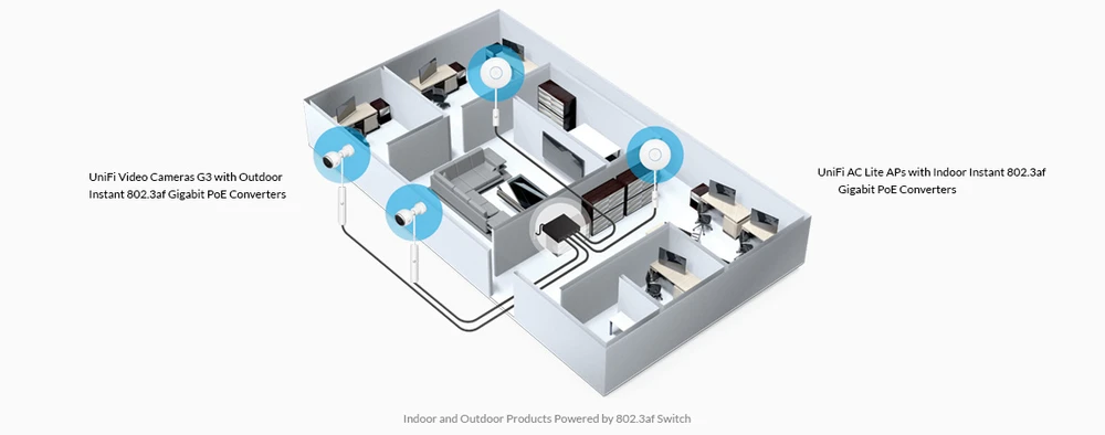 Instant 802.3af Gigabit PoE Converter pozwala na przekształcenie prawie każdego urządzenia Ubiquiti® zasilanego poprzez PoE (Power over Ethernet) w produkt w pełni kompatybilny ze standardem 802.3af. Urządzenie redukuje napięcie standardu 802.3af (48V) do wartości 24V (Passive PoE). Wersja Instant 802.3af Gigabit PoE Converter obsługuje prędkości transmisji do 1000 Mbps. Jest to wersja to użytku wewnątrz pomieszczeń.