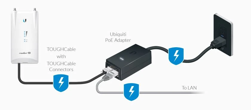 Uziemione adaptery PoE marki Ubiquiti o mocy 80 W 1.48 A są wysoce niezawodne, w połączeniu z kablem Ubiquiti TOUGHCable i złączem TOUGHCable Connectors zapewniają uziemienie i ochronę przeciwprzepięciową, eliminując skutki wyładowań elektrostatycznych (ESD). Urządzenie dostarcza napięcie wyjściowe o wartości 54 V i obsługuje przepustowość sieci Gigabit.
