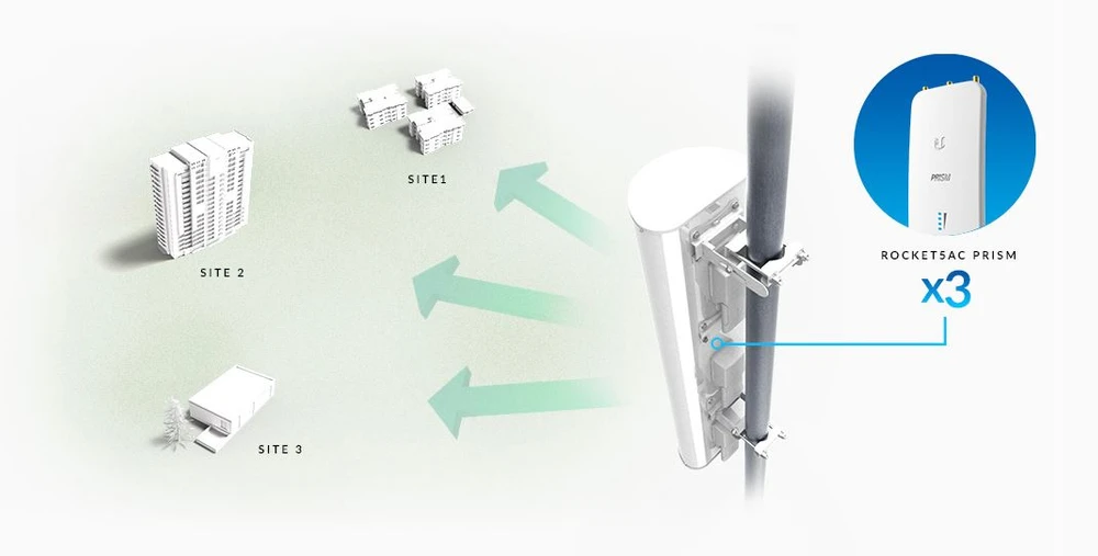 Zamontowanie trzech urządzeń Rocket 5 AC Prism na jednej antenie airPrism pozwala zwiększyć przepustowość oraz zmniejszyć wykorzystanie powierzchni postojowej wieży, co skutkuje znacznym obniżeniem kosztów instalacji.