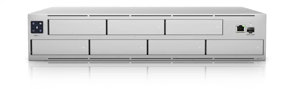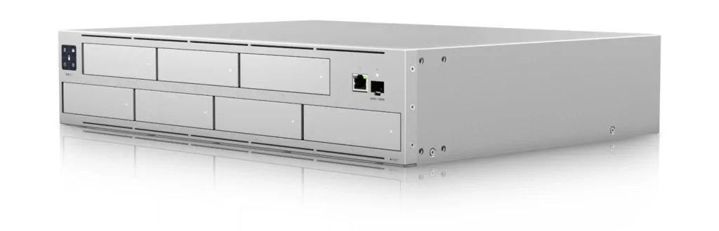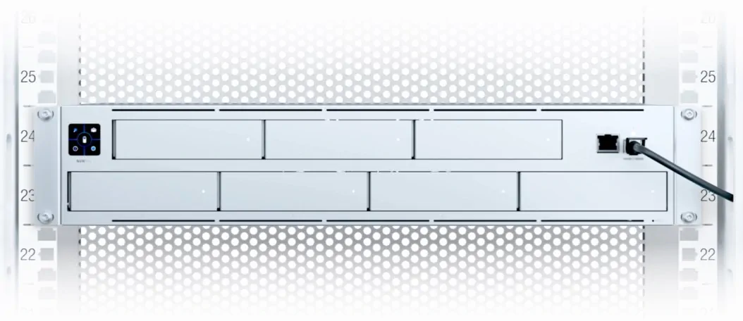 Wysoka dostępność UniFi Protect Network Video Recorder Pro jest zapewniona dzięki szybkiemu portowi 10G SFP+ oraz gigabitowemu portowi LAN RJ45. W przypadku przerwy w dostawie prądu lub awarii zasilacza przewidziano złącze dla systemu redundantnego zasilania UniFi SmartPower (USP-RPS). Inżynierom Ubiquiti udało się zmieścić rejestrator wideo z maksymalnie 7 jednostkami pamięci masowych w kompaktowej obudowie o wysokości zaledwie 2U, którą można zamontować w szafie rack 19".