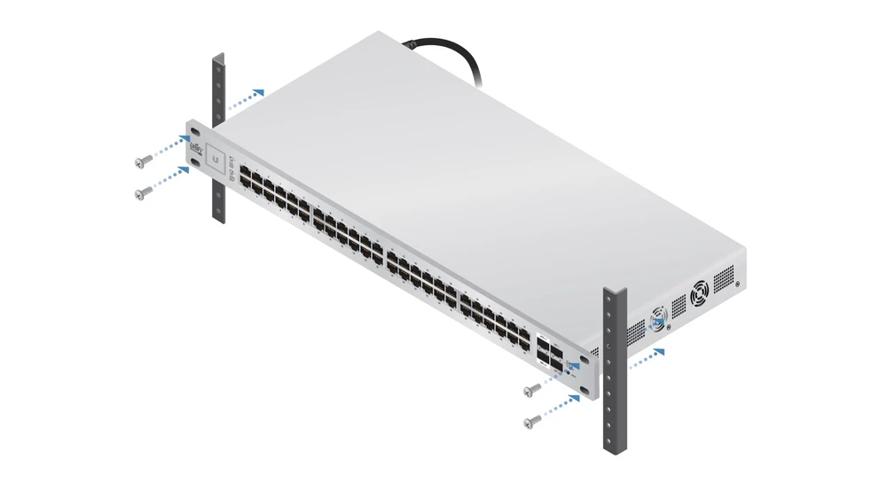 Przełącznik UniFi US-24-250W może być w prosty sposób zamontowany w szafie rackowej za pomocą znajdujących się w zestawie śrub montażowych.