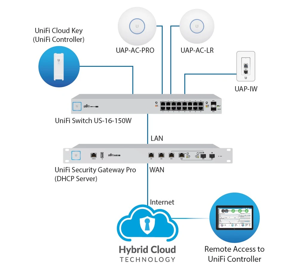 UniFi® Switch US-16-150W firmy Ubiquiti to w pełni zarządzalny gigabitowy przełącznik. Urządzenie zapewnia wysoką wydajność dzięki 18 niezależnym portom przełączającym. Dwa porty SFP oferują łączność optyczną, a 16 gigabitowych portów Ethernet oferuje PoE+ 802.3af/at lub pasywne PoE 24V z łączną mocą 150W. To wysokiej jakości sprawdzony switch dla wymagających sieci.
