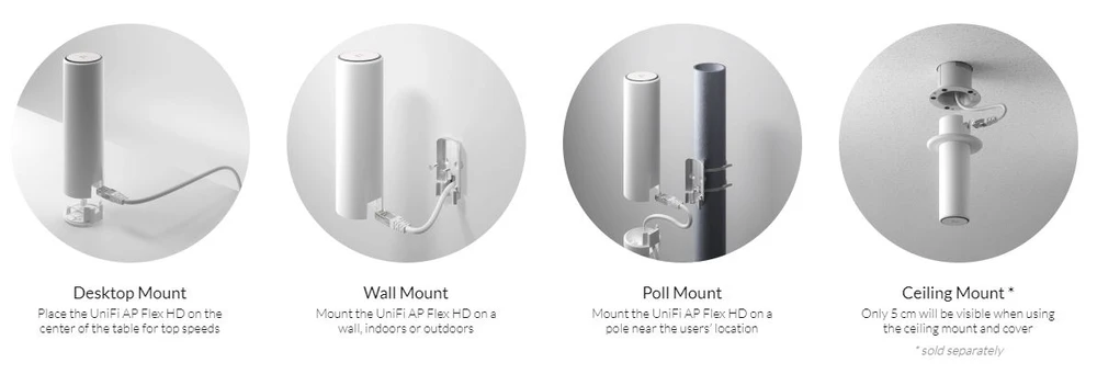 Minimalistyczny design i kompaktowa konstrukcja pozwalają na umieszczenie urządzenia UniFi AP Flex HD na pulpitach, ścianach, sufitach czy na słupach.