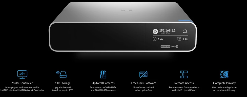 Cloud Key Gen2 Plus to niewielkie i łatwe w użyciu rozwiązanie typu Plug-and-Play, które umożliwia zarządzanie kamerami. Dzięki prostemu procesowi konfiguracji i szybkiemu wdrożeniu, będziesz mógł nagrywać do 1600 godzin materiału filmowego na wbudowanym twardym dysku o pojemności 1 TB lub rozbudować go, aby przechowywać jeszcze większą ilość materiałów wideo.