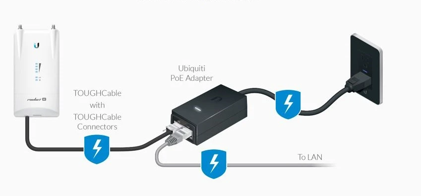 Adaptery PoE są bardzo niezawodne, gdy używane z kablem Ubiquiti TOUGHC, zapewniają uziemienie i ochronę przed przepięciami, eliminując skutki wyładowań elektrostatycznych (ESD).