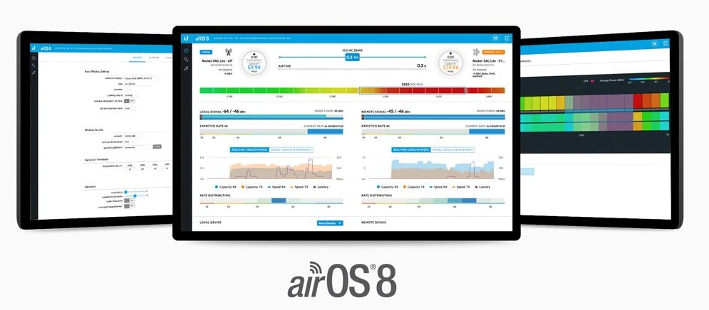 Oprogramowanie airOS 8 oferuje zaawansowane funkcje, w tym obsługę protokołu airMAX ac, analizę sygnału w czasie rzeczywistym, a nowa i ulepszona konstrukcja zwiększa użyteczność urządzenia.