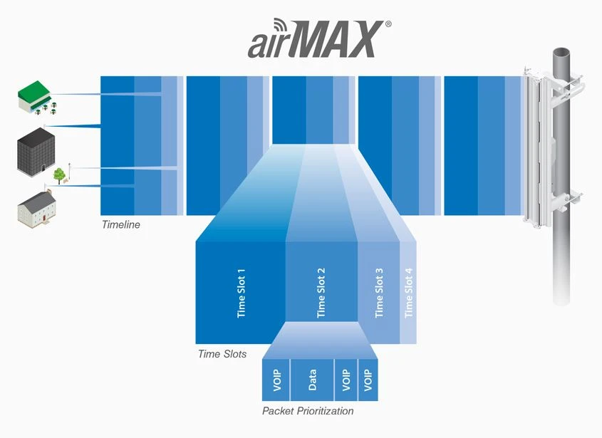 Oprogramowanie Ubiquiti airmax z niestandardowym układem scalonym znacznie zmniejsza opóźnienie TDMA i poprawia skalowalność sieci. Niestandardowy procesor zapewnia sprzętową akcelerację planisty airMAX, wspierając wysoką szybkość transmisji danych i gęstą modulację wykorzystywaną w technologii airMAX ac.