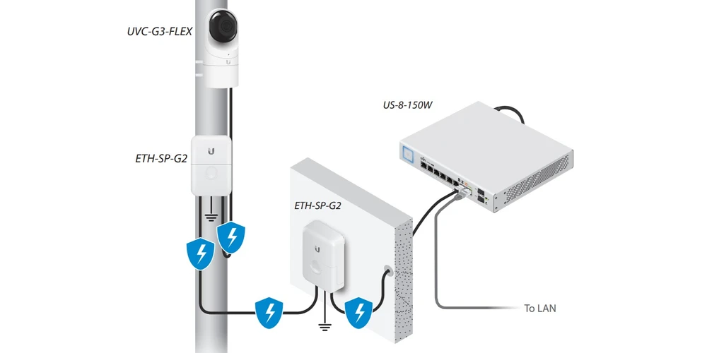 Ochrona przeciwprzepięciowa jest kluczowa dla zapewnienia bezpieczeństwa instalacji zewnętrznych. Aby skutecznie chronić urządzenia, zaleca się umieszczenie dwóch zabezpieczeń przeciwprzepięciowych typu ETH-SP-G2 - jeden blisko kamery oraz drugi przy wejściu do budynku. Dzięki ETH-SP-G2 przepięcia zostaną pochłonięte i bezpiecznie rozładowane do uziemienia.
