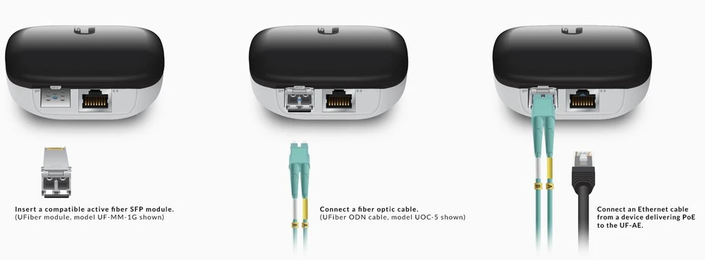 UFiber Active Ethernet umożliwia łatwą konwersję sygnału ze światłowodu na kabel miedziany. Obsługuje prędkości do 1 Gbps. Konwerter jest kompatybilny ze wszystkimi modułami UFiber SFP i może być zasilany pasywnym PoE 24 V lub 802.3af.
