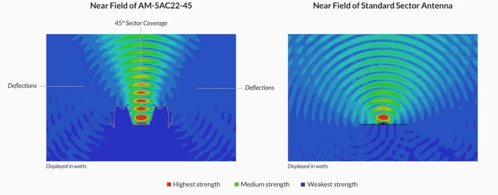 Porównaj schemat anteny sektorowej airMAX ac model AM-5AC22-45 ze schematem standardowej anteny sektorowej. Zwróć uwagę na doskonałą odporność na zakłócenia i wydajność transmisji.