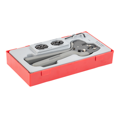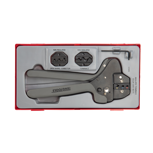 Praktyczny zestaw do zaciskania końcówek. Zestaw składa się z 4 elementów, w których skład wchodzą: narzędzie zaciskowe wraz z trzema wymiennymi głowicami oraz klucz trzpieniowy sześciokątny 2.5 mm. Głowice służą do dołączania izolowanych i nieizolowanych końcówek do przewodów elektrycznych. Zestaw dostarczany jest w pojemniku z wkładką z tworzywa oraz praktyczną pokrywą. Po jej zdjęciu zestaw pasuje do całości systemu Get Organized do skrzynek i wózków narzędziowych Teng Tools.