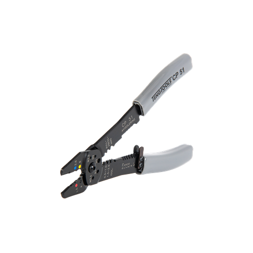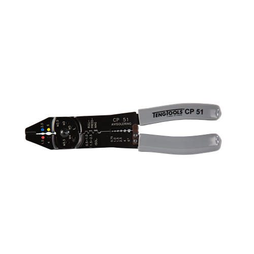 Szczypce Teng Tools do zaciskania konektorów i łączników bez lutowania. Posiadają ostrza do skracania wkrętów bez uszkadzania gwintu w rozmiarach mieszczących się w przedziale M2.5‑M5, jak również specjalne ostrze do ucinania przewodów. Szczypce do konektorów posiadają również specjalnie wyprofilowane wycięcia umożliwiające ściąganie różnej grubości izolacji z przewodów wg oznaczeń umieszczonych na powierzchni narzędzia w przedziale pomiędzy 0,75 mm do 6 mm. Uchwyt wykonany z grubej warstwy tworzywa sztucznego zapewniającej właściwy chwyt narzędzia. Model CP 51 wykorzystuje się do zaciskania konektorów izolowanych oraz zaciskania zawiniętego przewodu