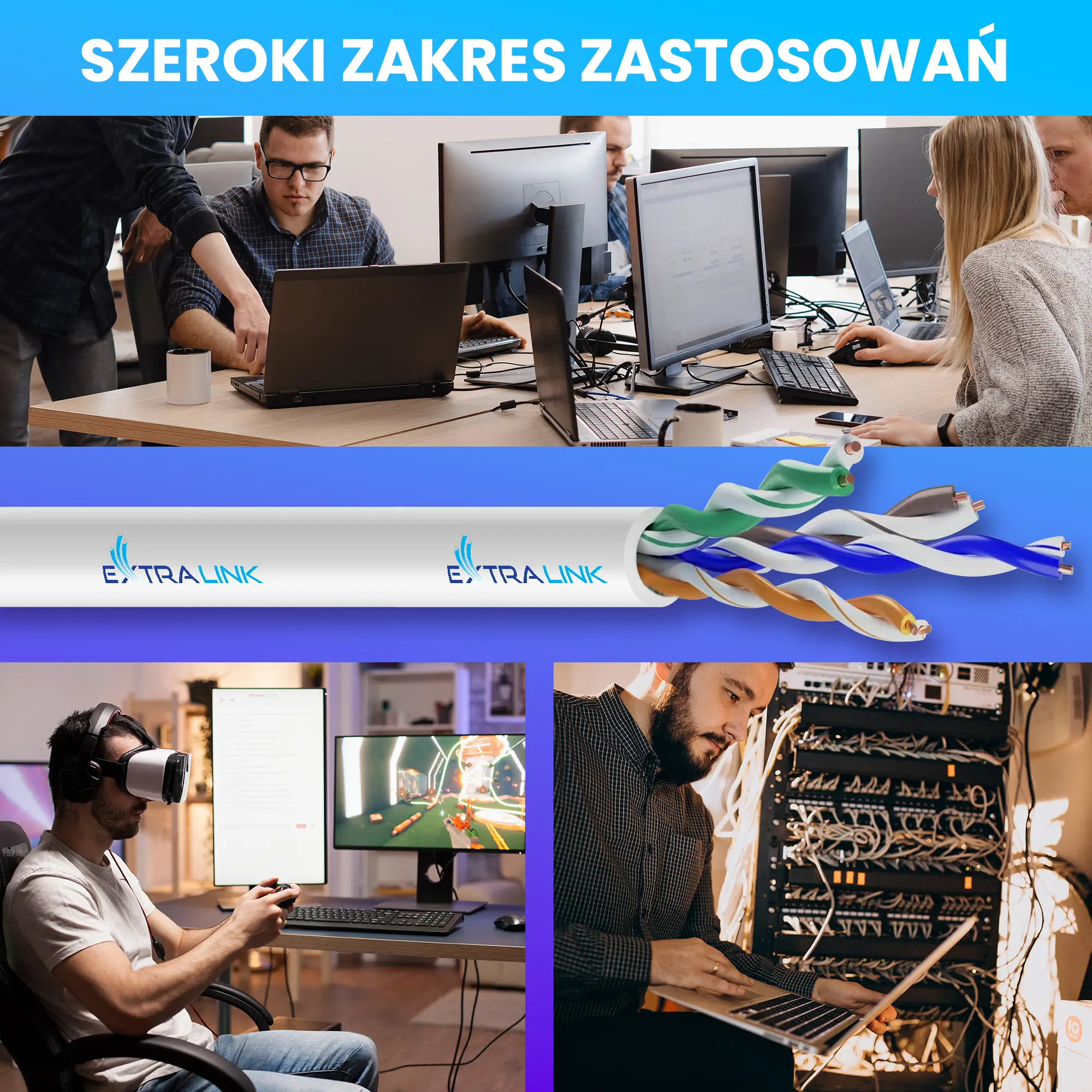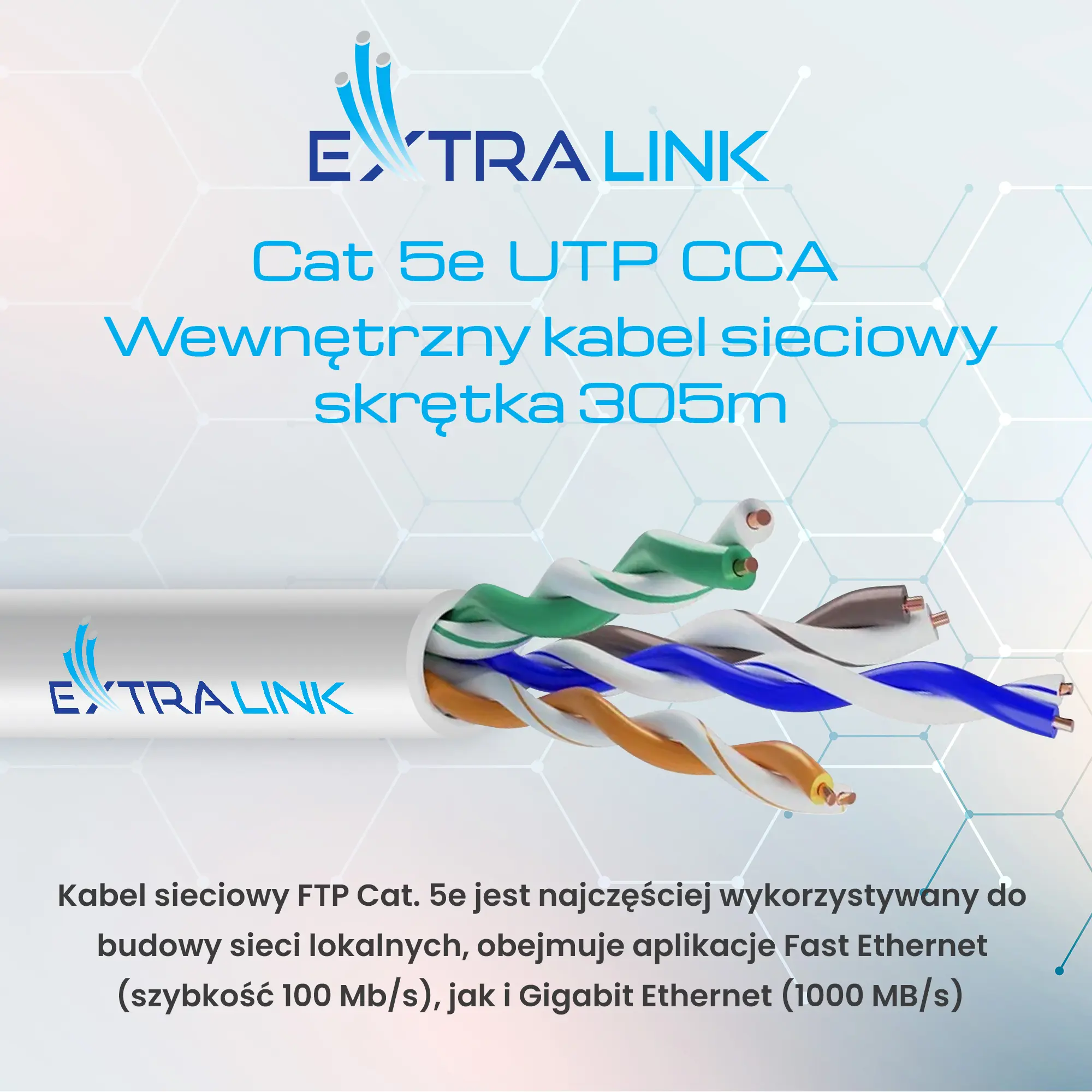 Kabel Extralink CAT 5E UTP (U/UTP) CCA przeznaczony jest do użytku wewnątrz budynków, nadaje się idealnie do budowy sieci w biurach. Skrętkę stosuje się często w instalacjach telewizji przemysłowej, gdzie jednym kablem można przesłać sygnał wizji z kilku kamer i zasilanie.