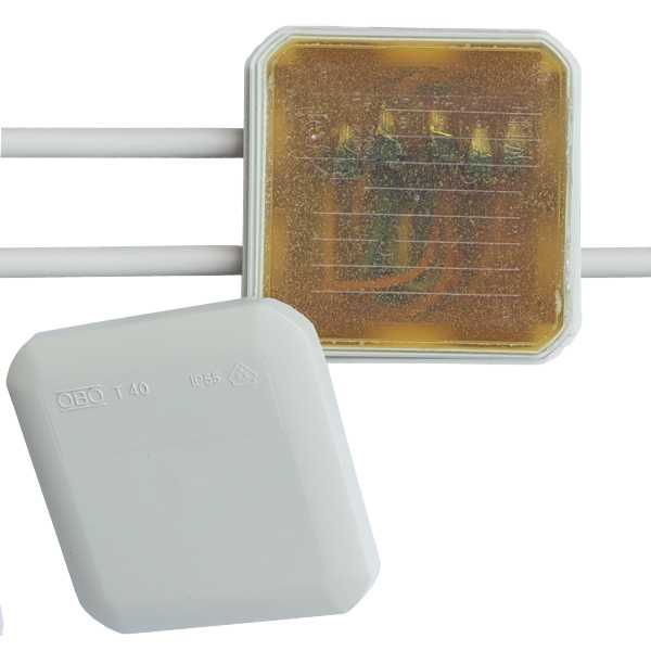 Uniwersalna puszka przelotowo-odgałęźna do żył o przekroju do 6mm2, w zestawie z usuwalną żywicą CG i złączkami WAGO