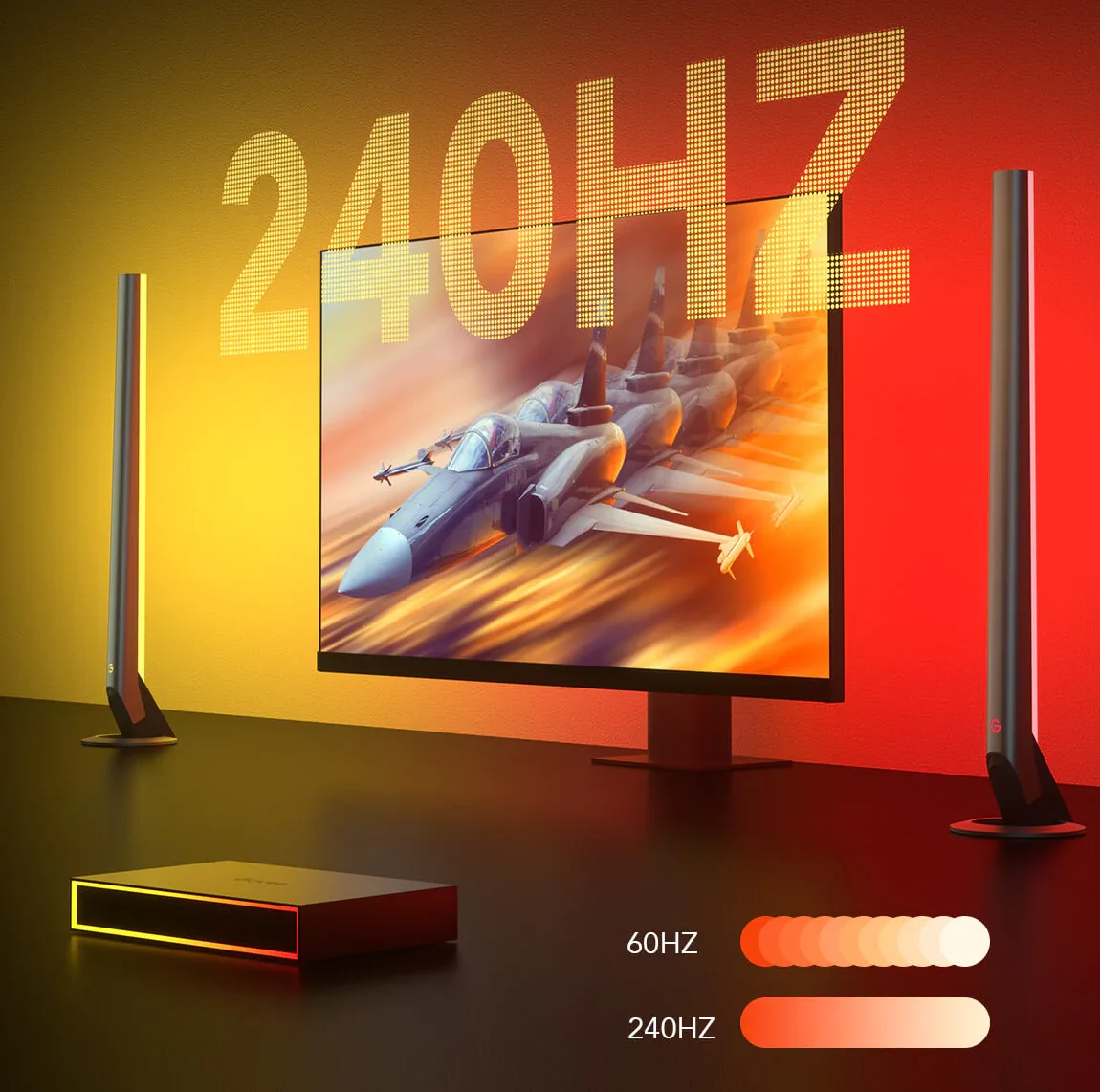 Zestaw Govee AI Gaming Sync Box Kit wykorzystuje zaawansowaną technologię sztucznej inteligencji do analizy obrazu generowanego przez Twoją konsolę do gier lub komputer. Na podstawie tej analizy zestaw automatycznie dostosowuje kolory światła LED do tego, co widzisz na ekranie. Dzięki temu możesz cieszyć się dynamicznym i spójnym oświetleniem, które reaguje na każdą zmianę sceny, akcji lub nastroju w grze. Zestaw Govee AI Gaming Sync Box Kit obsługuje odświeżanie do 240 Hz, co oznacza, że każda zmiana koloru na ekranie będzie natychmiast widoczna wokół niego.