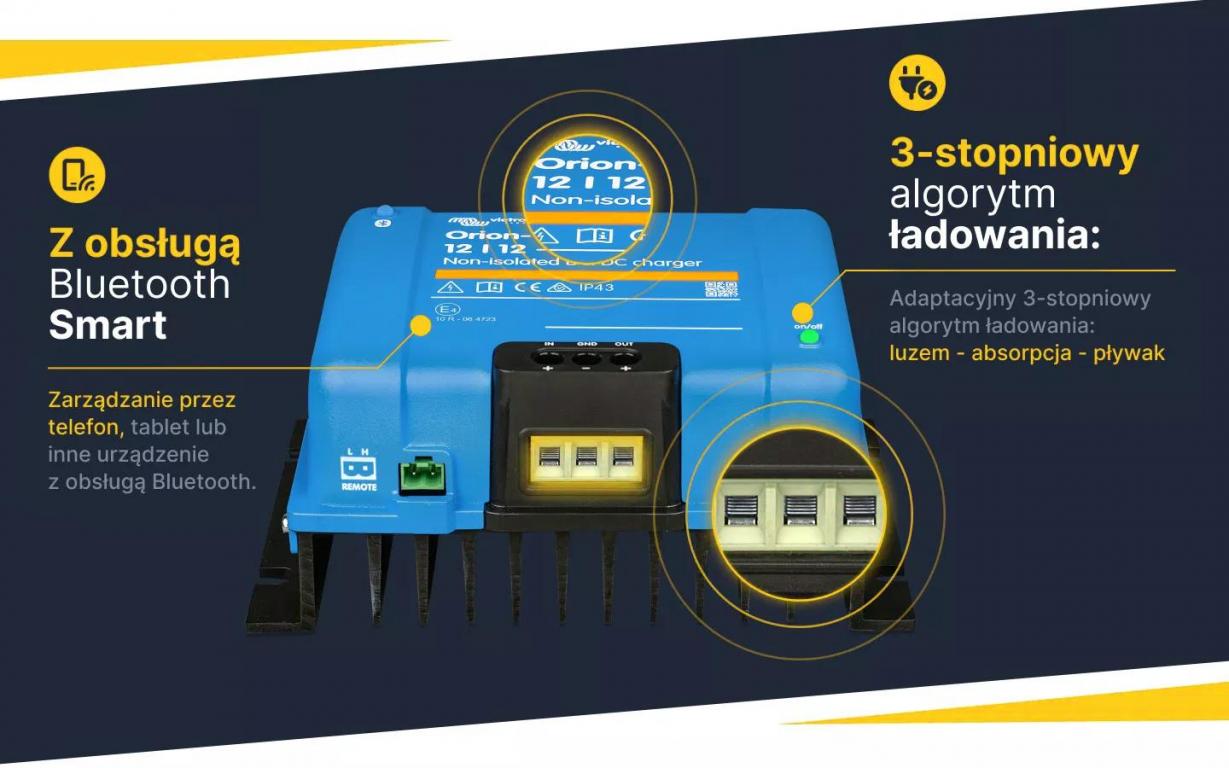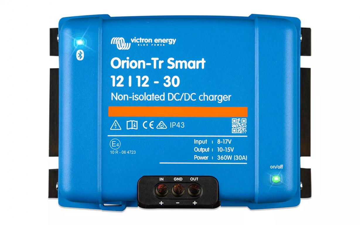 Ładowarka Orion-Tr Smart DC-DC jest profesjonalną, adaptacyjną, 3-stopniową ładowarką DC na DC z wbudowanym układem Bluetooth. Przeznaczona do stosowania w instalacjach dwu-akumulatorowych w pojazdach lub łodziach, w których do ładowania akumulatora bytowego wykorzystywany jest alternator i rozruchowy. Urządzenie można monitorować i programować przez Bluetooth, oraz można nim zdalnie sterować za pomocą zdalnego wyłącznika. Ładowarki Orion-Tr Smart można używać w instalacjach 12 V lub 24 V, a nadaje się zarówno do akumulatorów ołowiowo-kwasowych, jak i litowych. Dostępne są modele o mocy nawet 400 W, a celem zwiększenia mocy wyjściowej można równolegle łączyć ze sobą nieograniczoną ilość urządzeń. Może pracować w temperaturze nawet 55°C, a pełną moc nominalną utrzymuje w temperaturze do 40°C.