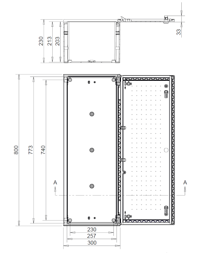 - Od góry obudowa posiada wysunięty daszek który zabezpiecza przed wnikaniem wody kiedy drzwi są otwarte. Chroni on również uszczelkę przed długotrwałym kontaktem z cieczami co mogłoby mieć negatywny wpływ na właściwości poliuretanowej uszczelki przy spadkach temperatury.